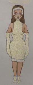 I designed a further four garments that were simplified creations of the tundra concept. I felt that the garment needed to be simple but effective and stay true to my original idea so that it was less difficult for me to bring to life, due to a lack of experience in sewing. I also started considering what materials I might use to develop the garment. Crochet was one of main features of these designs as well as the idea of up cycling charity shop knit wear, I was still unsure of what material I may use for the dress though.