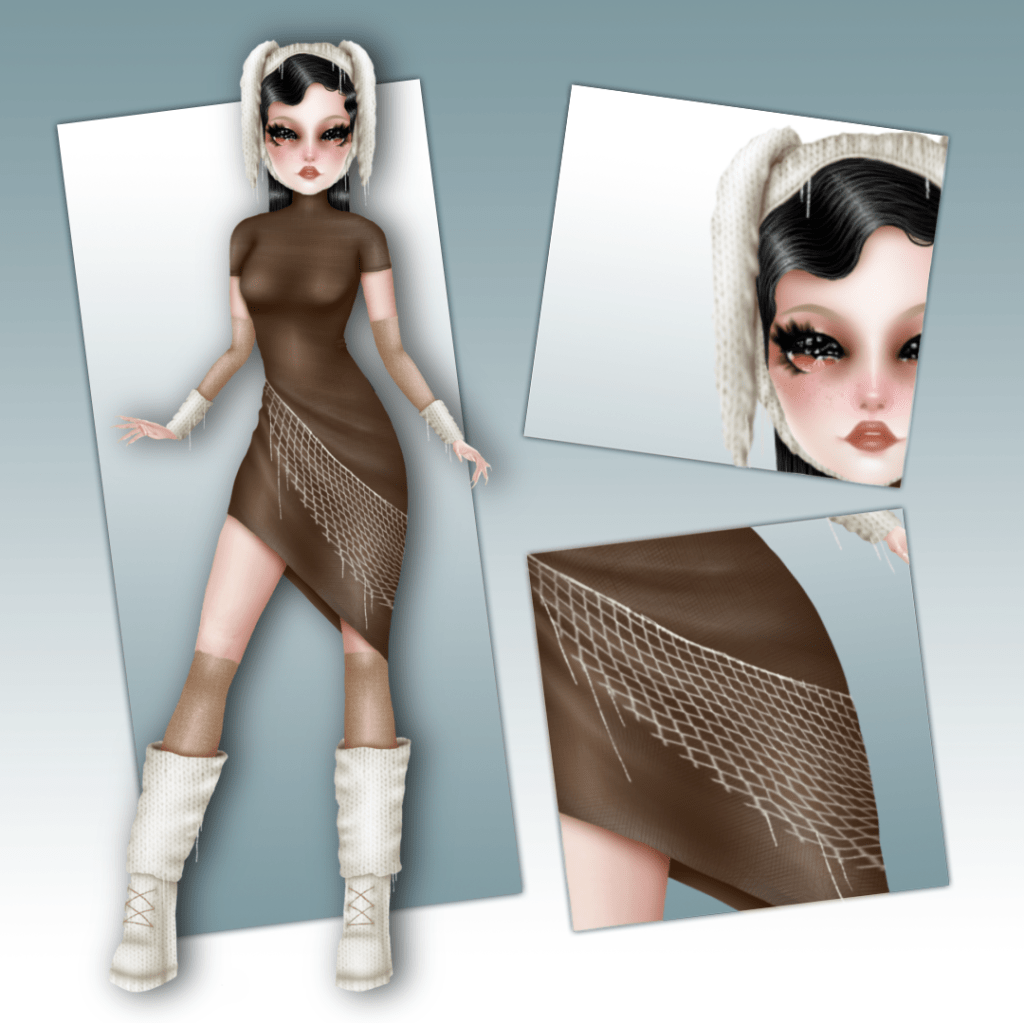 I created a more finished and refined digital fashion illustration that was a culmination of the different interpretations of the concept that I had worked on. I wanted to show the different textures that I imagined the garment having and also decided with this that I wanted the dress to be a shiny silk fabric that would contrast nicely with the knitted areas of the garment and give the garment more variation.